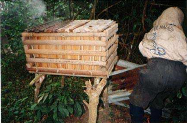 A wooden hive costs between $10 and $20 and usually lasts 4 to 5 years. Though the palm hive only lasts 2 to 3 years it is easy to replace, being made up locally and the top bars can simply be transferred to the new hive. Top bars are replaced following harvest or inspection as necessary. Instead of using purchased top bars many people now use straight pieces of Nkooko (Raphia spp.) of the correct width. As these have a groove on one side melted wax can be run along to provide a foundation for bees to begin constructing comb.