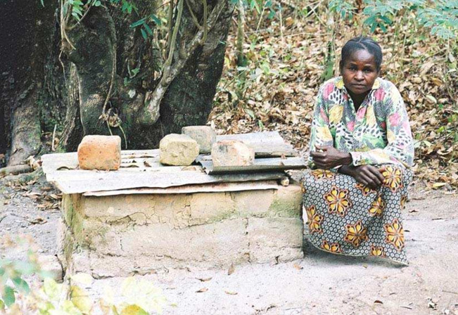 Mama Matondo of Muingu village with a hive made from burnt clay bricks set on the ground. A strong colony and plenty of ashes scattered round the hive discourages ants.