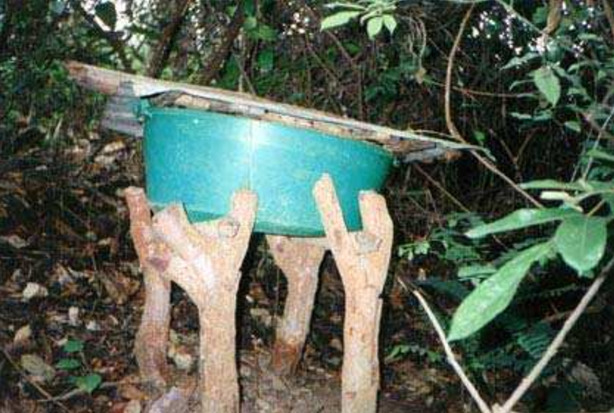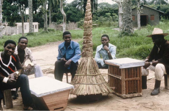 In recent years the shortage and expense of timber and corrugated iron sheet have encouraged people to use alternative materials for beehives. The range of substitutes includes old 200-liter fuel drums cut in half. Their ends removed, and their sides pushed together until they form an oblong approximately 50 cm wide to accommodate the top bars. Plastic basins and old truck fuel tanks have also been successfully converted. Hives have been built with bricks which have the additional advantage of being fire proof should a bush fire get out of control. Cheap hives can be made up from Nkooko (Raphia spp.) palm stems.