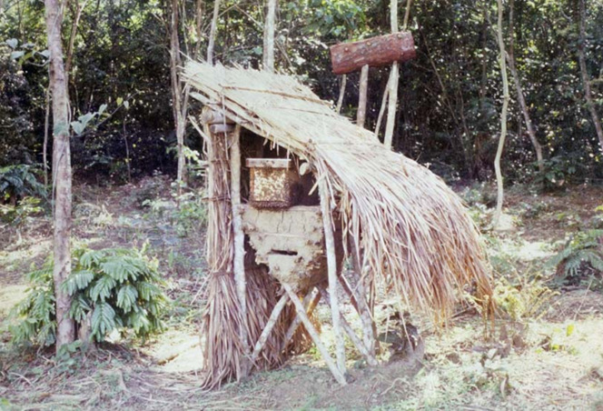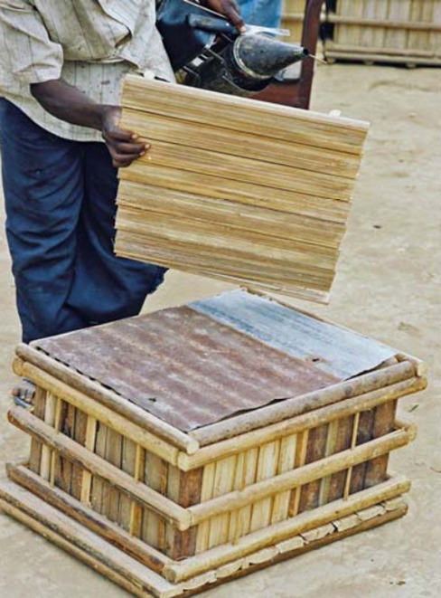 The Bimango hive, based on the Langstroth design, and made by a commercial beekeeper from Congo (Brazzaville). The hive is constructed from the midribs of raffia leaves and is pegged together with small raffia sticks instead of nails. Either top bars or frames are used. One or two supers are added to the brood chamber and a piece of fine mesh netting is used as a queen excluder.