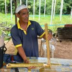 Sugar cane is planted in the forest gardens amongst various other plants. When harvesting, approximately 50 cm of the uppermost portion of the stalk is cut off at a 45-degree angle and replanted. This will ensure the growth of another sugarcane stalk. The sugar cane juice is extracted from the stalk with a vice, very similar to that used for pressing arrow poison.