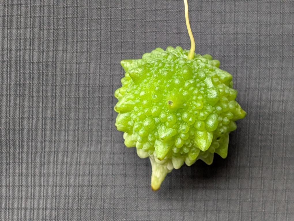 The fruits are small, measuring 3-5 cm (1.2-2 inches) in diameter and have a rounded to slightly egg-shaped outline. Botanists would call them globose to ovoid. They are covered with short, stout conical tubercles, from which their variety name of muricata (muricate = rough, warty) derives. The size and shape of fruits and spines clearly distinguish them from the cultivated form M. charantia and from wild species such as M. dioica. At the lower, pointed end of the immature fruit, the color often turns from green to a whitish color.