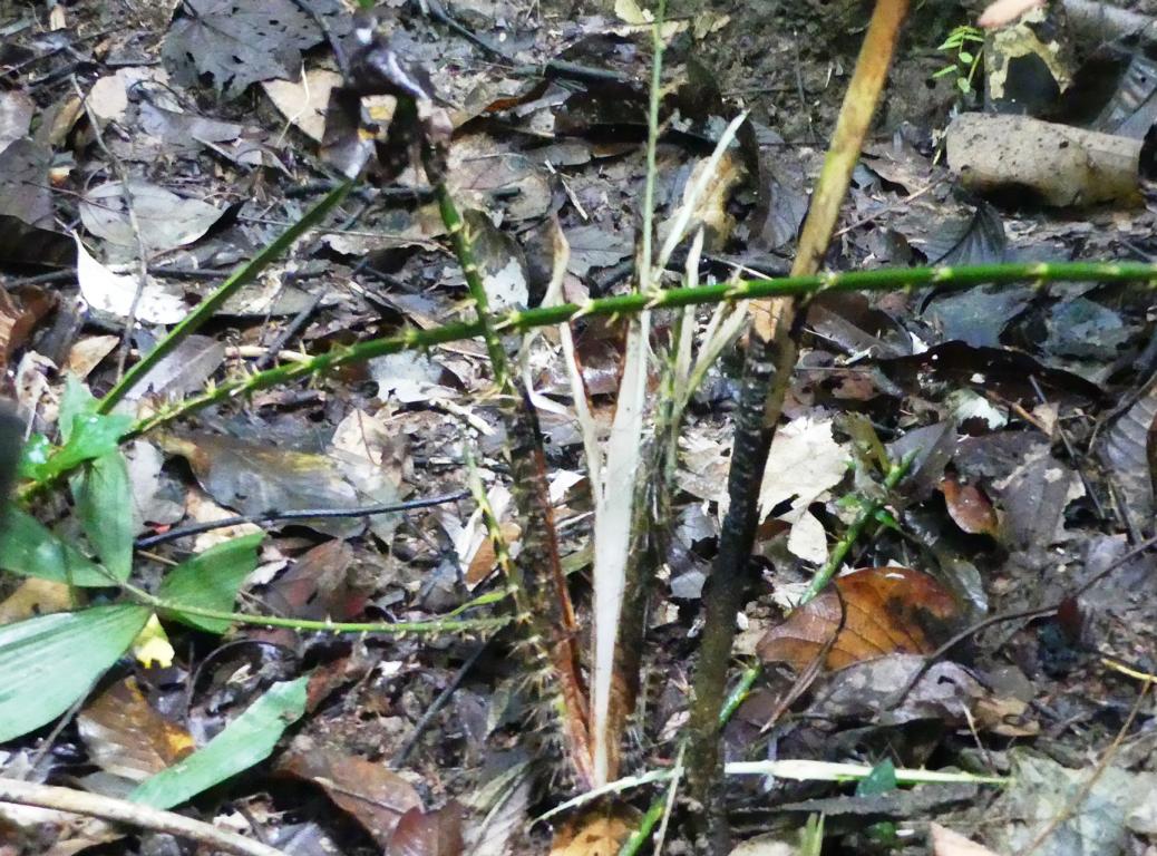 Tomlinson P.B. (2001) et al. describe the architecture of the stem axial bundles of Calamus rattan palms. In the following picture, such vascular bundles can be seen along the green stem of a shoot. This pattern on the stem is very conspicuous, even among the uniform greenish-brown color scheme of all the surrounding plants. Unfortunately, flagella – these whip-like structures – are not as easy to spot.