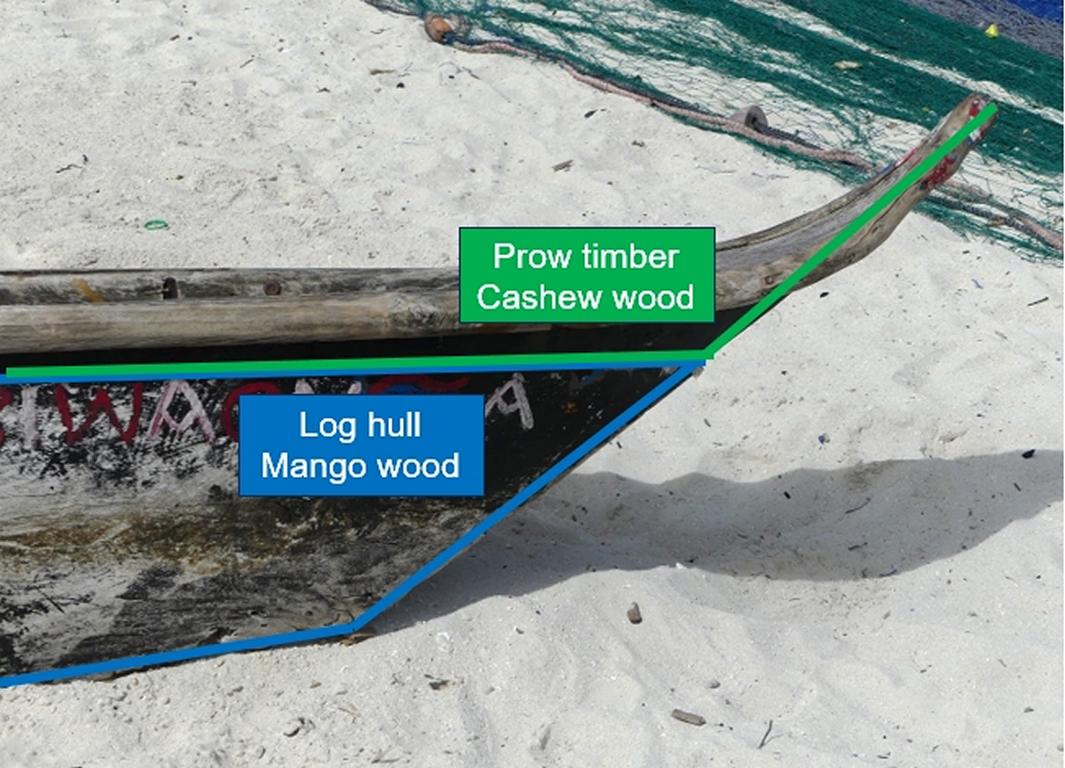 An upward-shaped piece of prow timber called kasama in Swahili, is added to the bow of the log hull. The wood used there should be light to raise the bow when the vessel is in the water. Cashew (Anacardium occidentale) timber—from cultivated fruit trees—is preferably used for this part of the boat.