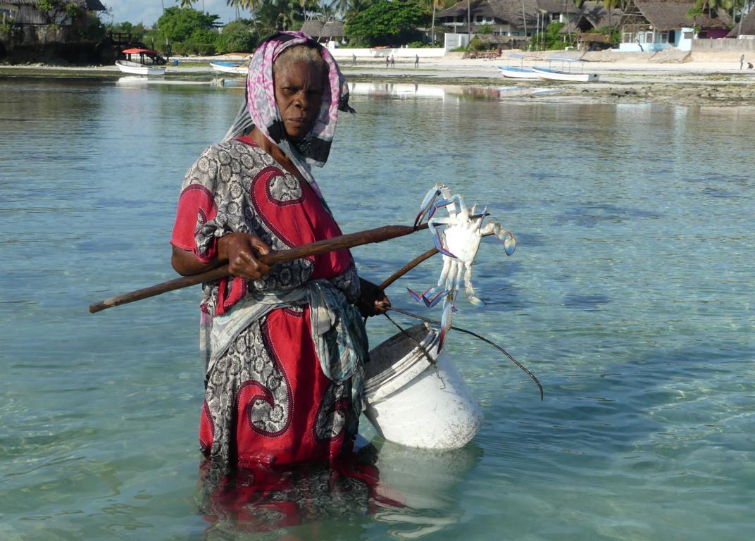 Africanan blue swimming crabs (Portunus segnis) are speared by beachcombers in the lagoons of Zanzibar. These crabs, however, are not the prime target when spearing but only an opportunistic by-catch. The prime target when using spears for fishing is octopuses. There are no official records of how many of these crabs are caught, nor which gender, age, or weight they are. They are just speared artisanally and used as subsistence food by the families. Official statistics of Zanzibarian fisheries authorities and research papers only contain records of mud crabs (Scylla serrata) caught in mangrove growing areas and fattened on crab farms.