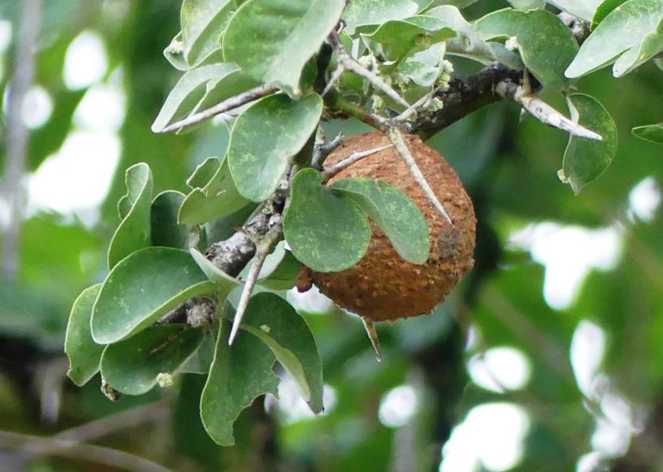 The tree shares a symbiotic relationship with large herbivores, particularly elephants. The fruit consists of a thin, leathery skin and a sticky, bittersweet pulp that elephants consume in large quantities. The hard internal seed is indigestible and must pass through the elephant’s digestive tract to facilitate germination. This process effectively thins the seed coat and disperses seeds across broad geographic areas via nutrient-rich manure.